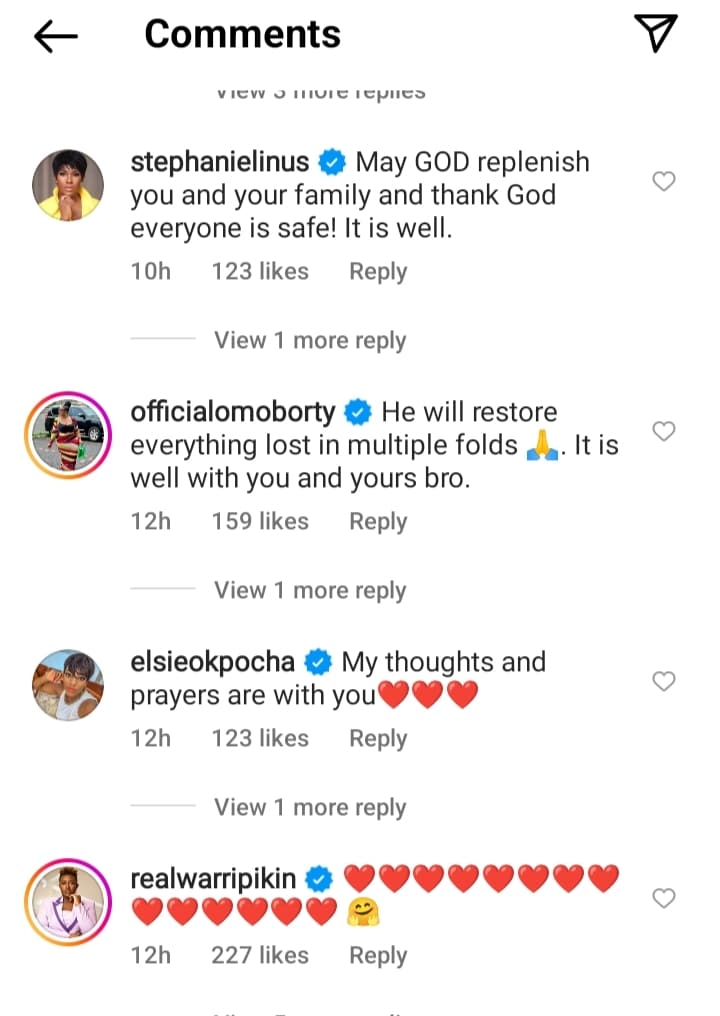 Elsie Okpocha joined a host of others to console the comedian saying, “My thoughts and prayers are with you.”