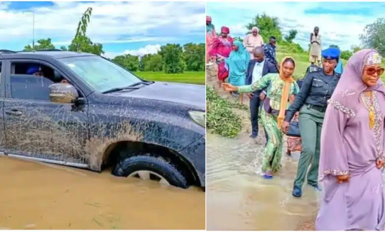 Bauchi First Lady Aisha Bala Muhammad forced to walk through floodwaters as her convoy gets stuck in mud