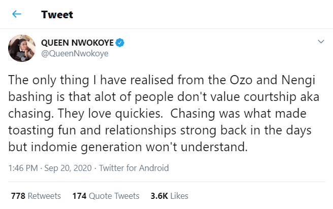 “The only thing I have realised from the Ozo and Nengi bashing is that alot of people don’t value courtship aka chasing. They love quickies. Chasing was what made toasting fun and relationships strong back in the days but indomie generation won’t understand.”