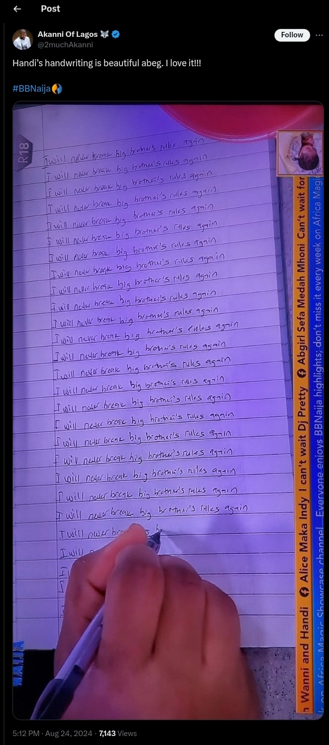 He added that the handwriting is so beautiful, saying, “Handi’s handwriting is beautiful, abeg. I love it!!!”