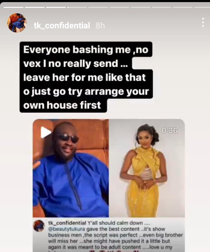 He wrote: “Everyone bashing me,no vex I no really send … leave her for me like that o just go try arrange your own house first.”