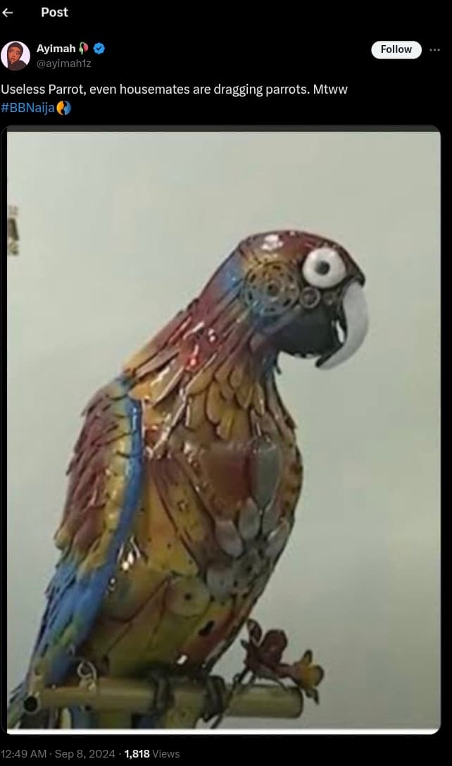 In response, the social media user criticized the parrot, saying, “Useless Parrot, even the housemates are dragging the parrot. Mtww.”