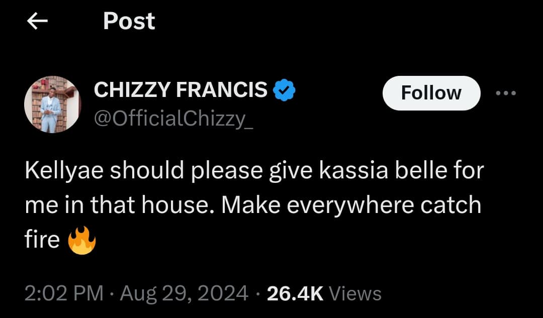 He wrote: “Kellyrae should please give Kassia belle for me in that house. Make everywhere catch fire 🔥.”