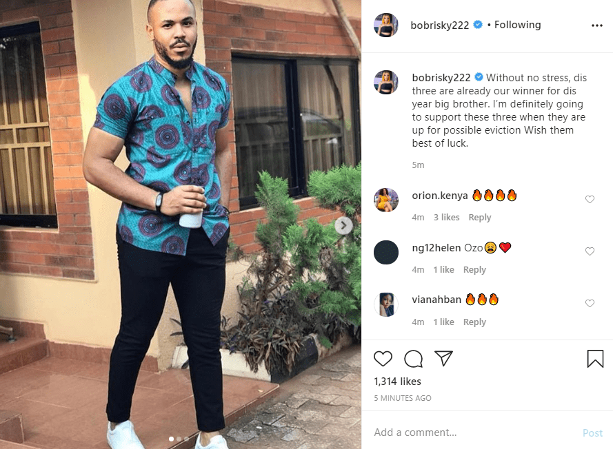 “Without no stress, dis three are already our winner for dis year big brother. I’m definitely going to support these three when they are up for possible eviction Wish them best of luck.”