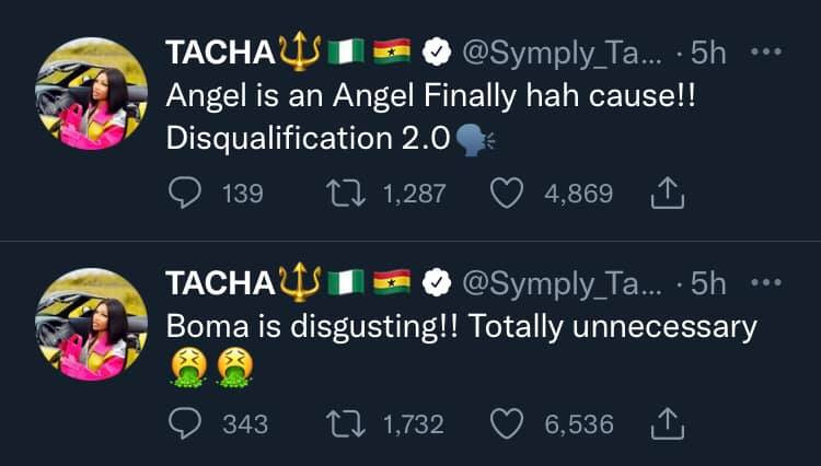 Big Brother Naija star, Natacha Akide, popularly known as Tacha has stated that Boma is disgusting following the fracas that ensued between him and Angel lately.
