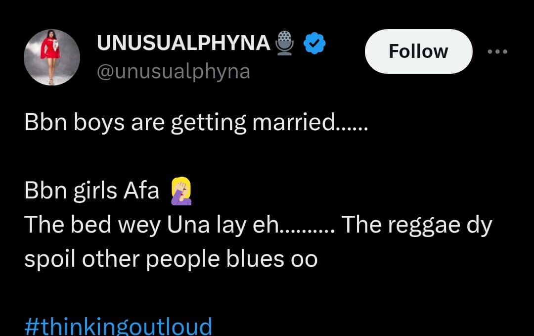 She wrote: “Bbn boys are getting married. Bbn girls Afa. The bed wey Una lay eh. The reggae dy spoil other people blues oo.”