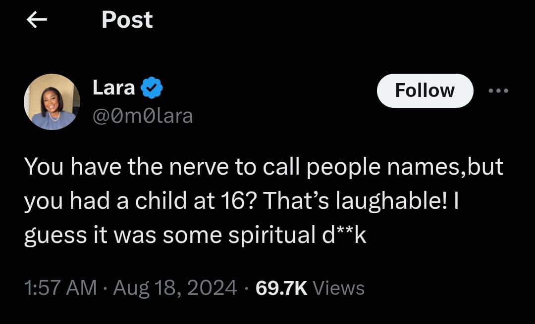Hours later, a viewer, seemingly unhappy with this, took to her social media page to criticize Ruthee, saying: “You have the nerve to call people names, but you had a child at 16? That’s laughable! I guess it was some spiritual d**k.”