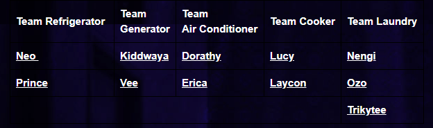 When the nation’s most trusted appliance maker decided to put the Big Brother Naija Housemates through their paces, the results were the stuff that dreams are made of. As always the Housemates had to be divided into teams and when the dust had settled, this was the breakdown.
