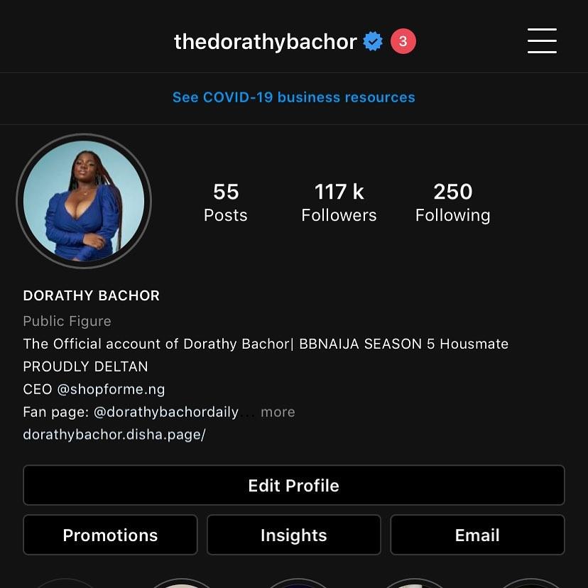 One of the BBNaija 2020 housemates, Dorathy, has gotten a verified badge on her Instagram page. This has made her the first female housemate to be verified on the 2020 edition of the show.