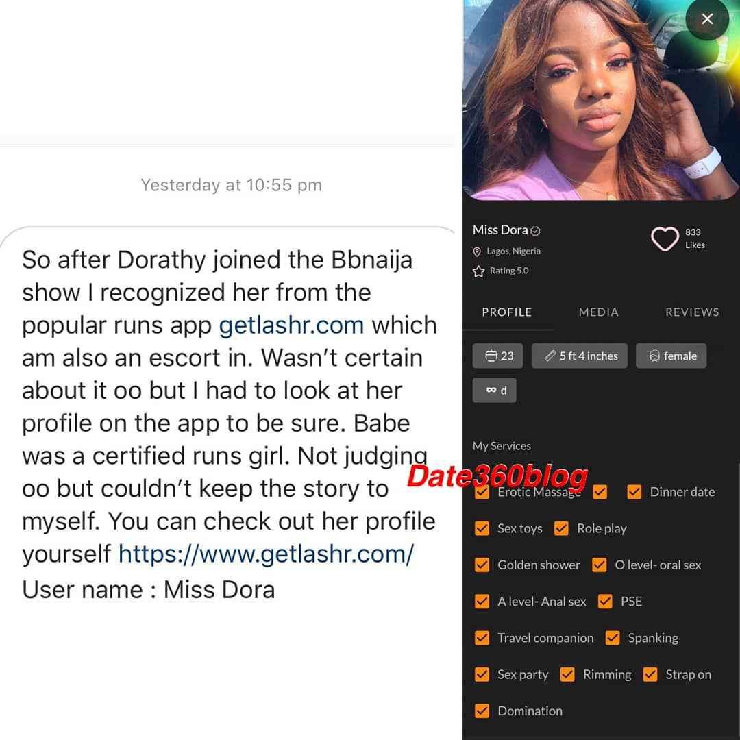 She wrote, “So after Dorathy joined the Bbnaija show. I recognized her from the popular runs app getlashr.com. Which I am also an escort in. Wasn’t certain about it oo but I had to look at her profile on the app to be sure. Babe was a certified runs girl. Not judging oo but couldn’t keep the story to myself. You can check out her profile yourself https://www.getlashr.com/ username: Miss Dora.”