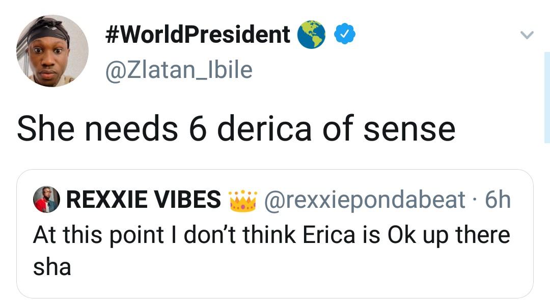 Twitter user identified as Rexxie had tweeted; “At this point I don’t think Erica is Ok up there sha”.