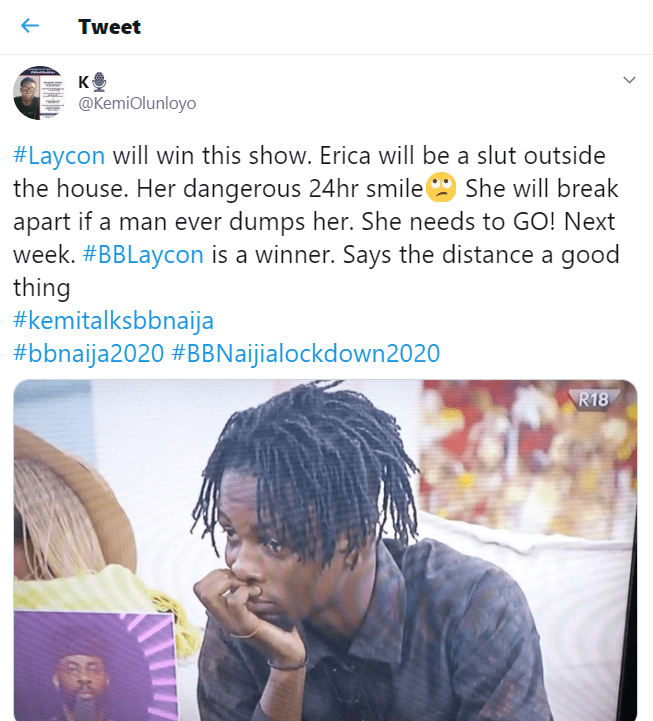 Kemi took to her Twitter account to say that Laycon will win the show and that Erica will be a slut outside the house.