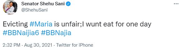 Senator, Shehu Sani has expressed how displeased he is over the fact that Maria got evicted from the BBNaija show last weekend, 29th August.