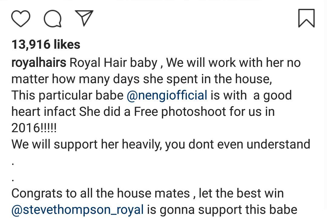 We will support her heavily, you dont even understand. Congrats to all the house mates , let the best win. @stevethompson_royal is gonna support this babe”