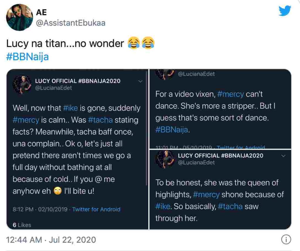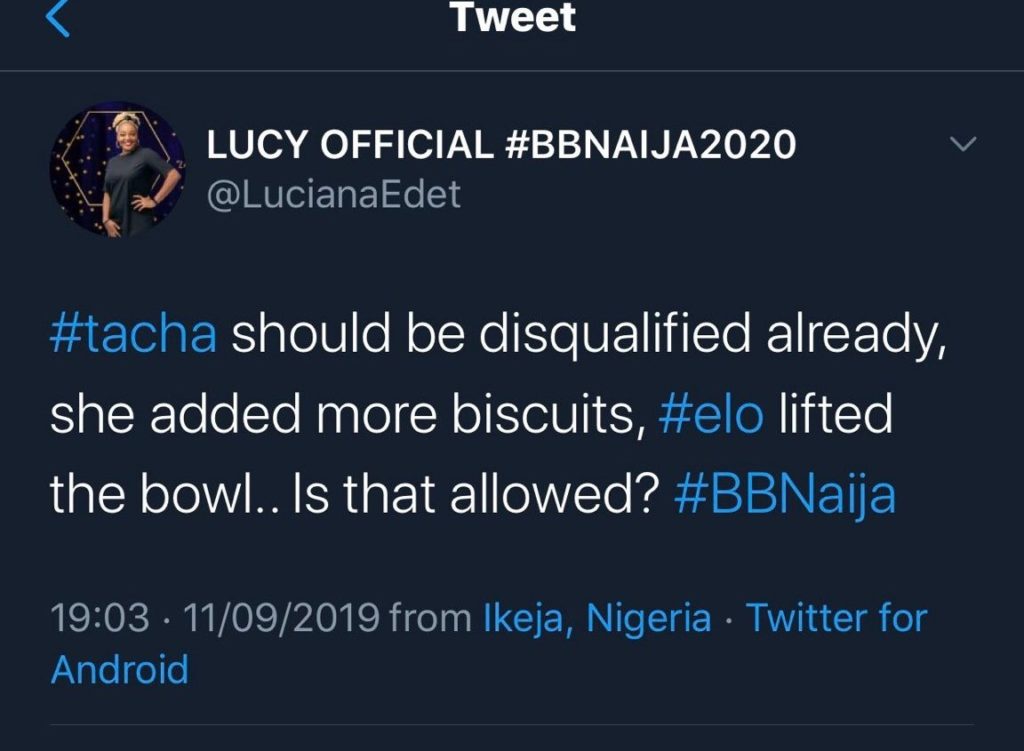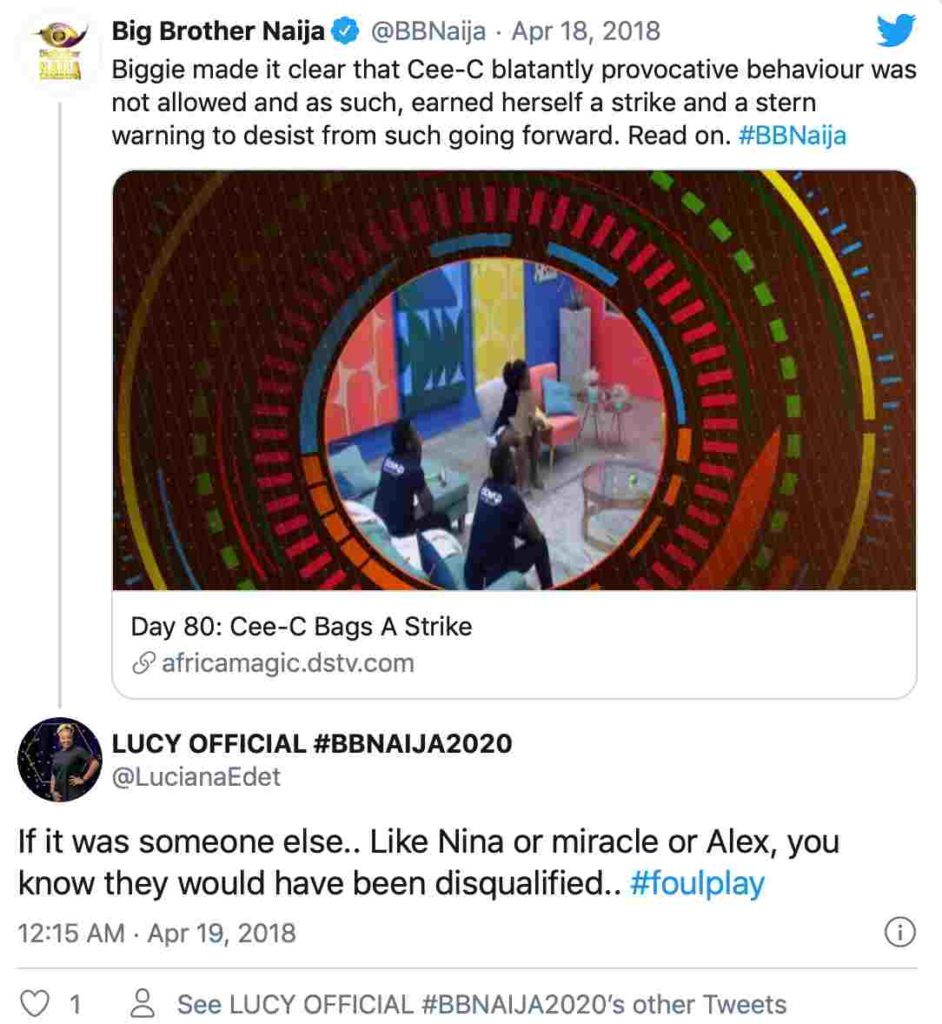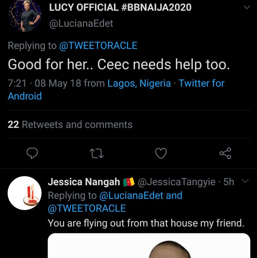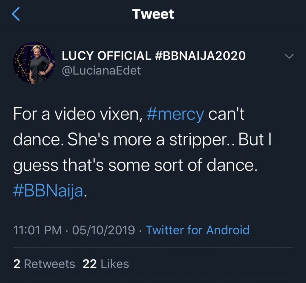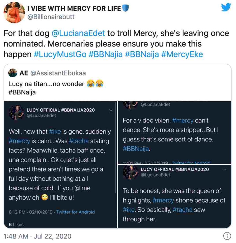 #BBNaija: Fans dig up old tweets of Lucy shading Mercy and calling for Ceec’s disqualification