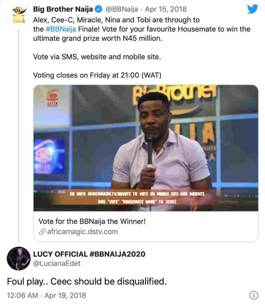 However, there’s a particular tweet that fans say she was shading 2019 Winner, Mercy and another tweet where she called for the disqualification of 2018 finalist, Cee-c.