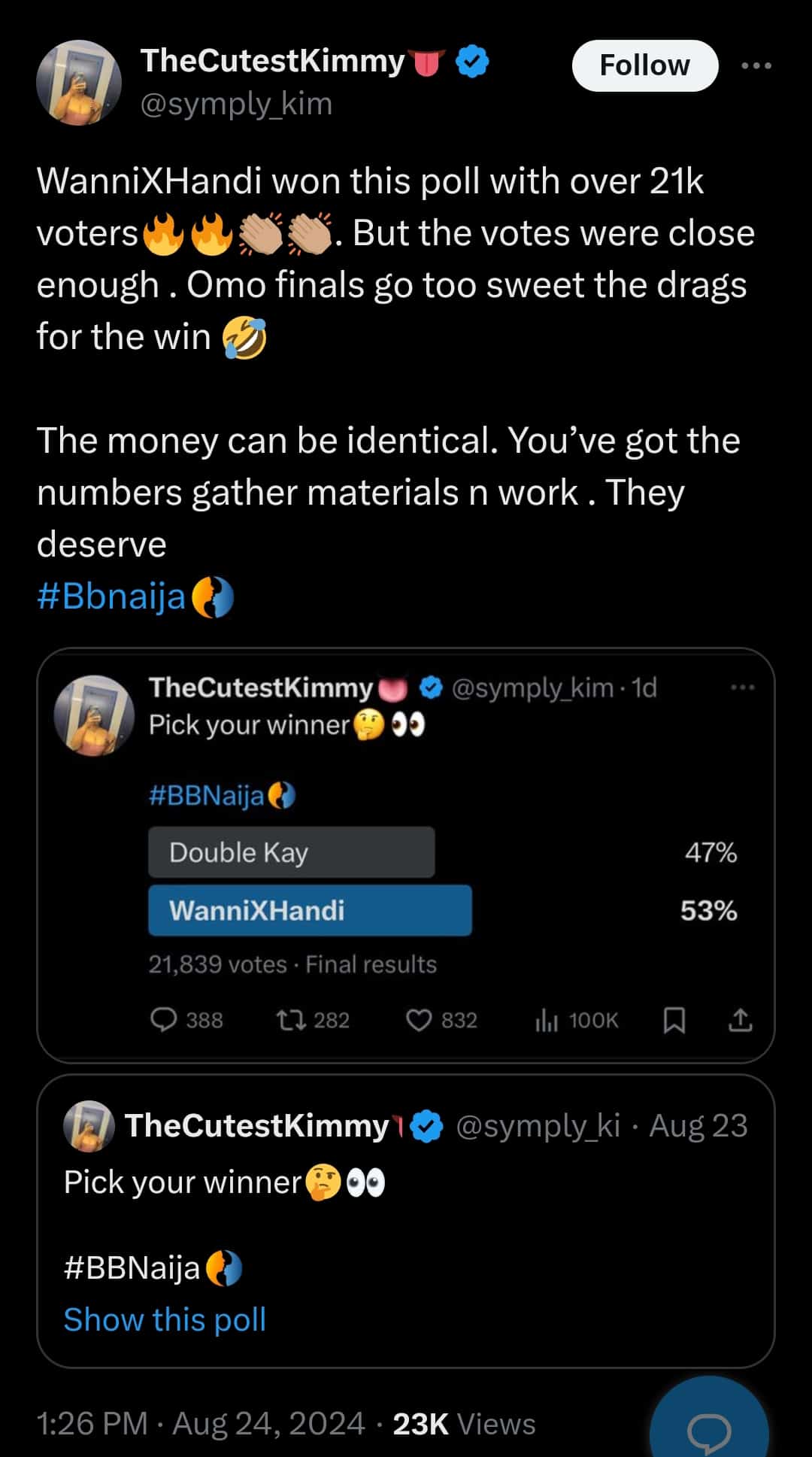 @yemostars: “Facebook peoples determined the winner. Check all the winners, Facebook is the only accurate. True wanni and handi are leading before but Double Kay make genuine friends than other pair, most of them have been evicted and their fans will vote for them. Double Kay already win.”