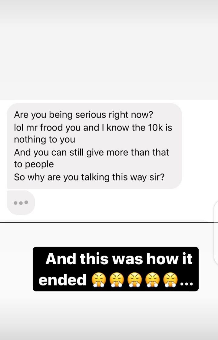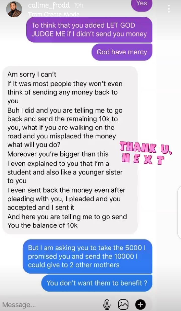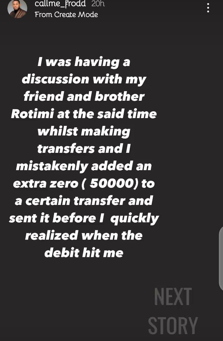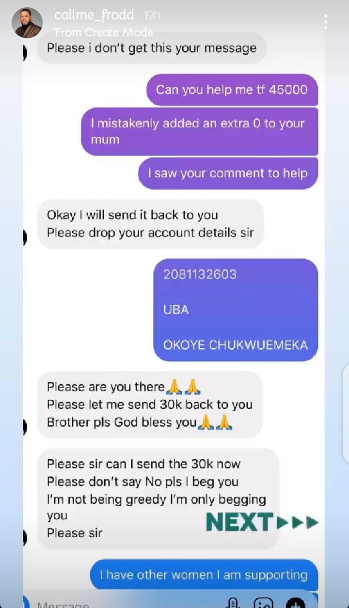 Former Big Brother Naija housemate, Frodd shares his awful experience with a single mother who’s a giveaway winner for refusing not to send back the complete money mistakenly deposited into her account.