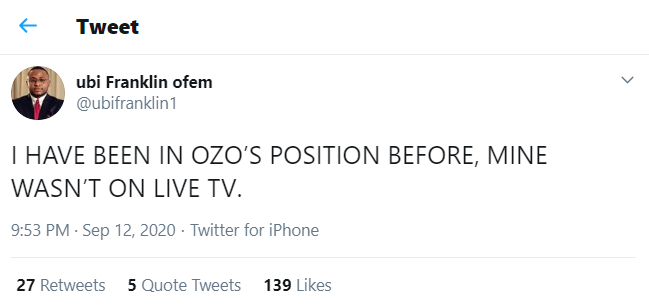 Ubi has now taken to Twitter to react, saying he has been in the same situation as Ozo, but that his own was not on live TV