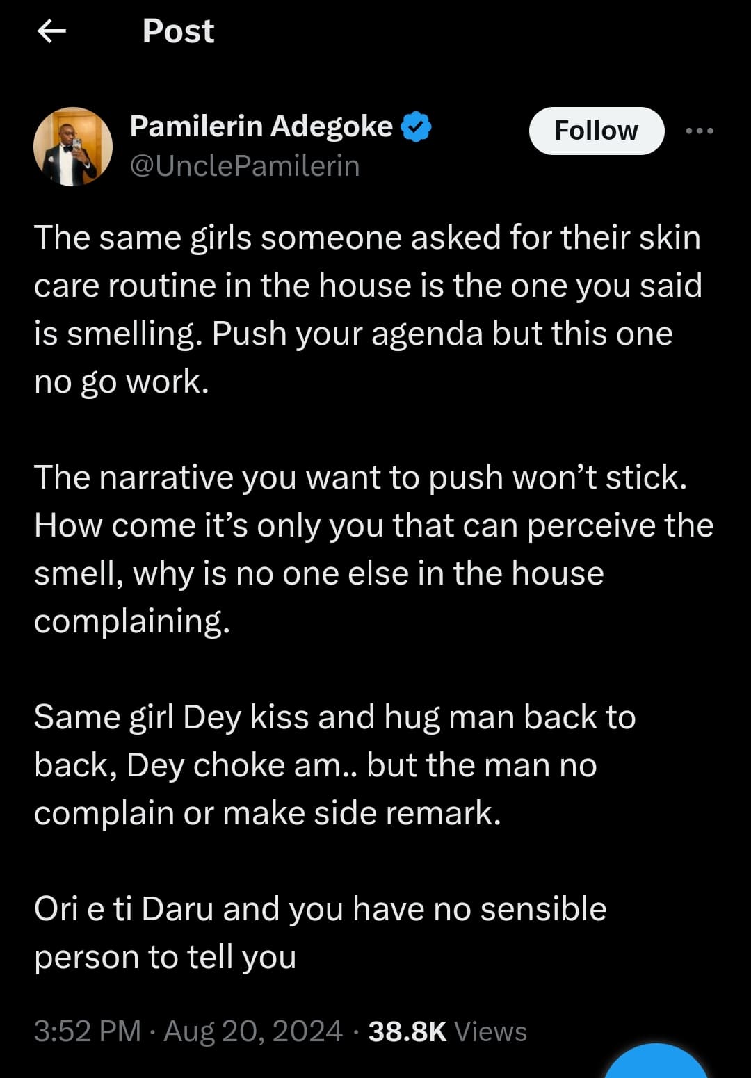 His statement: “The same girls someone asked for their skincare routine in the house are the ones you said are smelling. Push your agenda, but this one won’t work.”