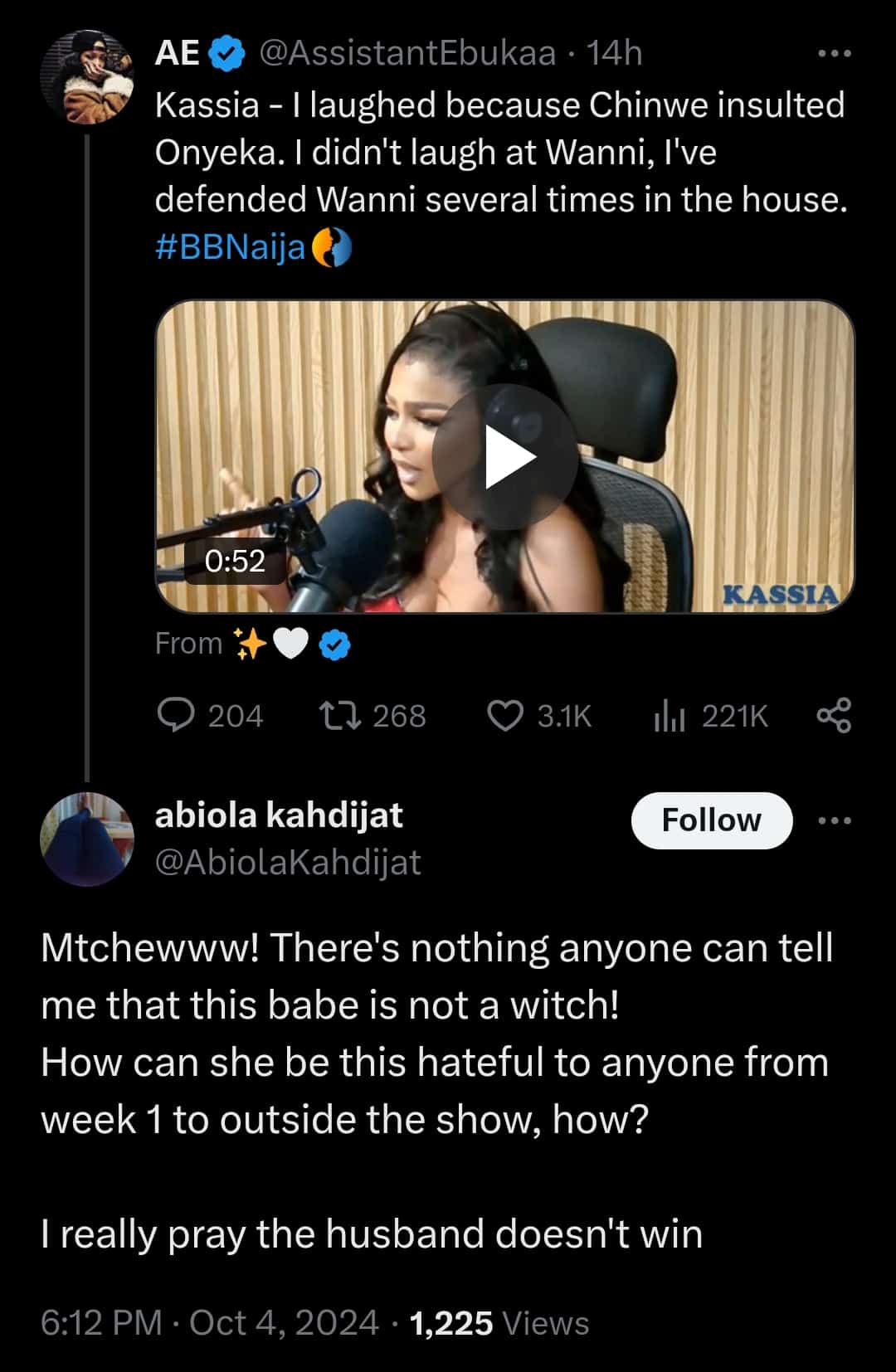 The viewer, identified as Abiola Kahdijat, expressed her hope that Kassia’s husband, Kellyrae, doesn’t win the show or the ₦100 million grand prize.