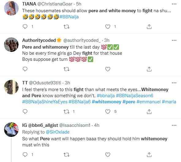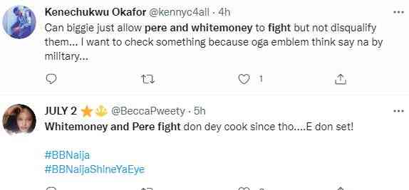 Social media users have also clamoured for a duel between Whitemoney and Pere as they wish the duo can be made to wrestle without being disqualified. The purpose of this according to them is to ascertain who is physically grounded between Whitemoney and Pere.