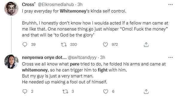 The recent altercation that was witnessed between Whitemoney and Pere has triggered some brouhahas online as people have aired their views as regards what transpired.