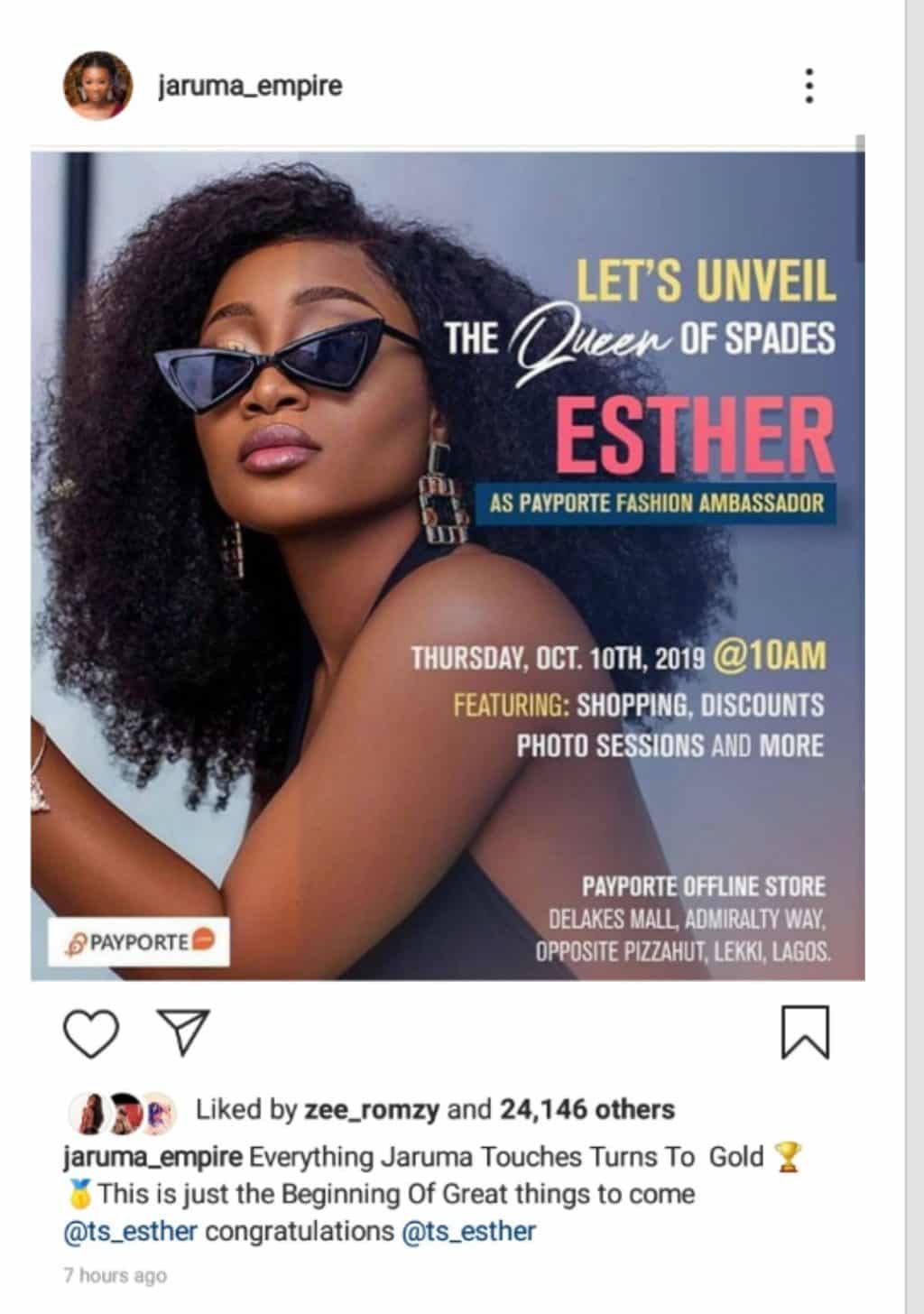 #BBNaija: Jaruma reacts as Esther bags an endorsement deal with PayPorte