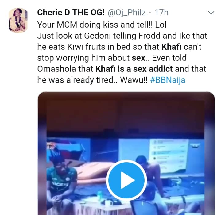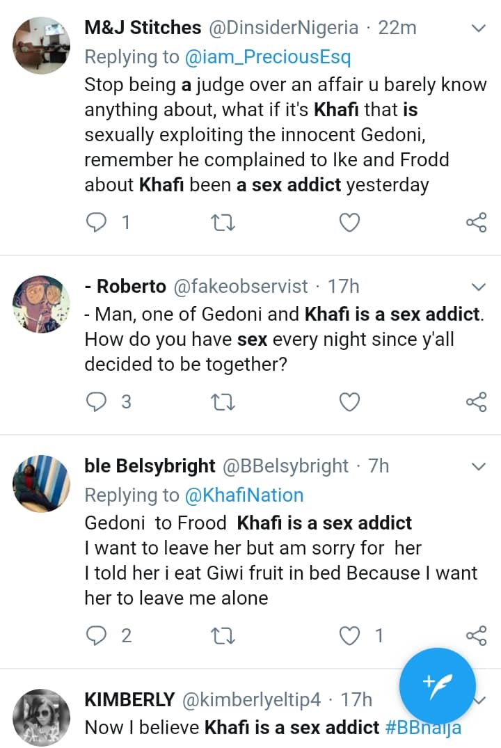 Khafi’s lover, Gedoni was heard telling Frodd that she is a sex addict and that she disturbs him a lot.