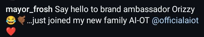 Mayor Frosh’s post read, “Say hello to the new brand ambassador, Orizzy 😂! Just joined my new family, AI-OT”.