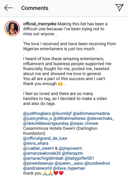 Big Brother Naija (BBNaija) housemate, Mercy Eke, penned an open appreciation individuals who supported her heavily.