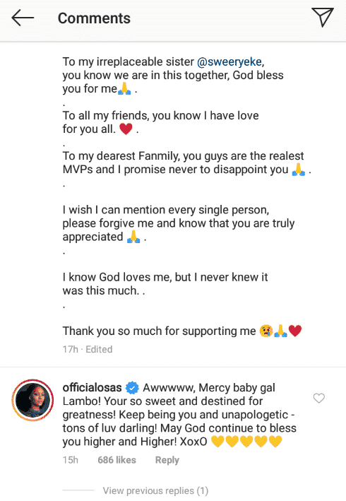 “I heard of how these amazing entertainers, influencers and business people supported me financially, fought for me, posted me, tweeted about me and showed me love in general. You all are a part of this success and I can’t thank you enough,” she said.