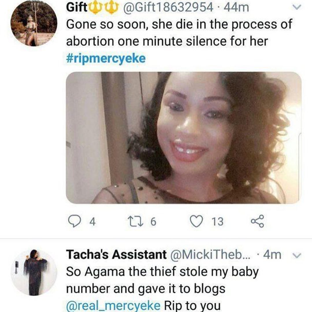 Promise Eke the sister of 2019 Big Brother Naija reality tv show winner, Mercy Eke has cried out as Tacha fans allegedly declare herself and her mother dead.