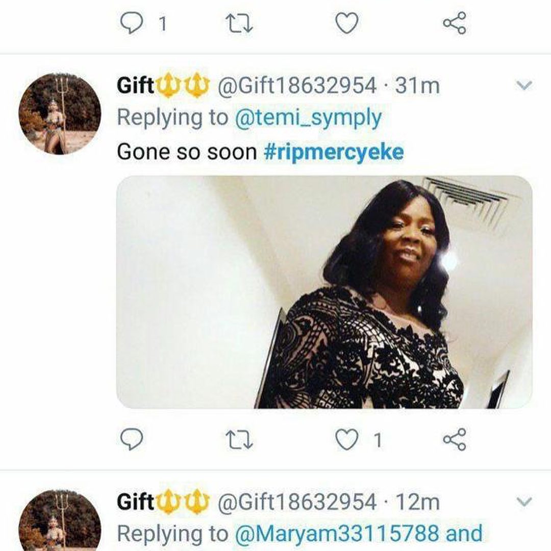 “Gd morning everyone pls u guys should come and judge this am heart broken I woke up this morning only for me to see what the titans posted what a wicked world , who did my mum offend? how can tacha and her toxic fans put up my precious Mummys picture and wrote gone too soon #rip what for? what are we dragging can’t they accept the fact that the lost out and move on why bringing my mum and I into this what has mercy done is she the first to win in this world? What is her crime pls am calling on all responsible mothers in Nigeria all over the country pls help me my mum doesn’t deserve this , am calling”