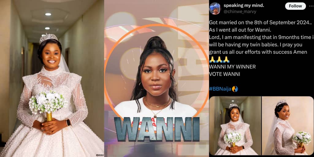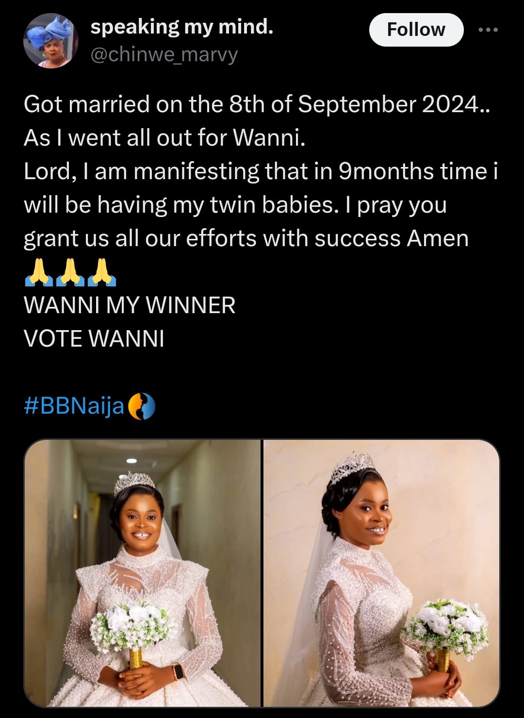 Her statement reads: “I got married on September 8, 2024. As I went all out for Wanni, Lord, I am manifesting that in nine months’ time, I will be blessed with twin babies. I pray you grant us all our efforts with success. Amen. Wanni, my winner! Vote Wanni!”
