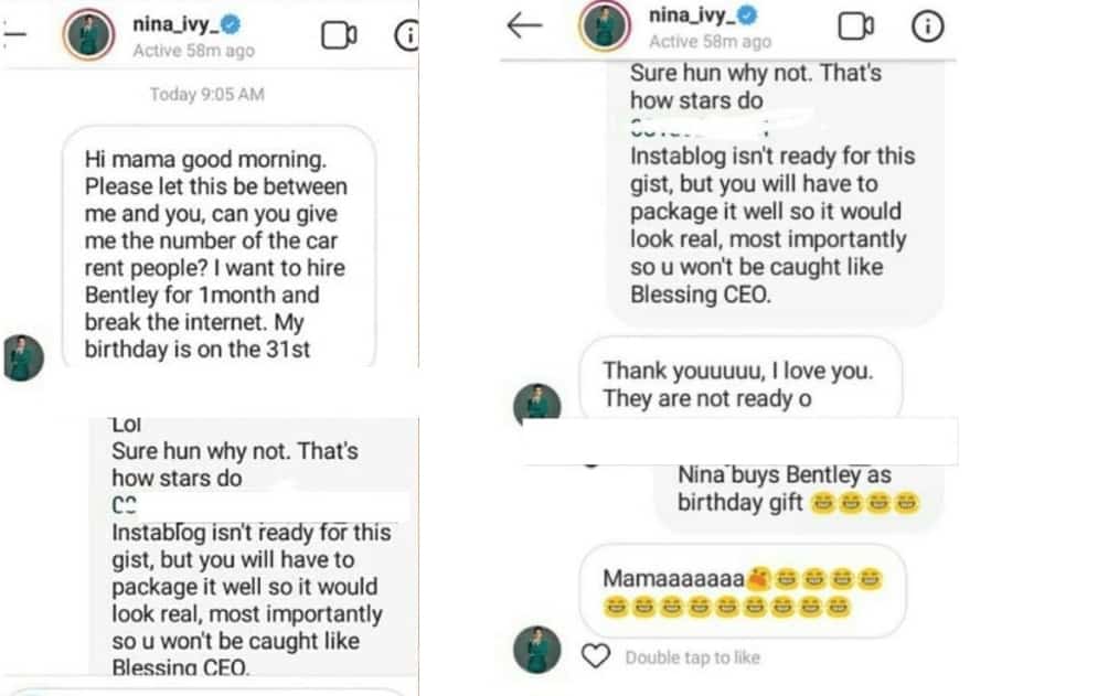 Big brother star, Nina’s Instagram DM has leaked again and it reveals how the reality star plans to rent a Bentley and fake buying it for her birthday.
