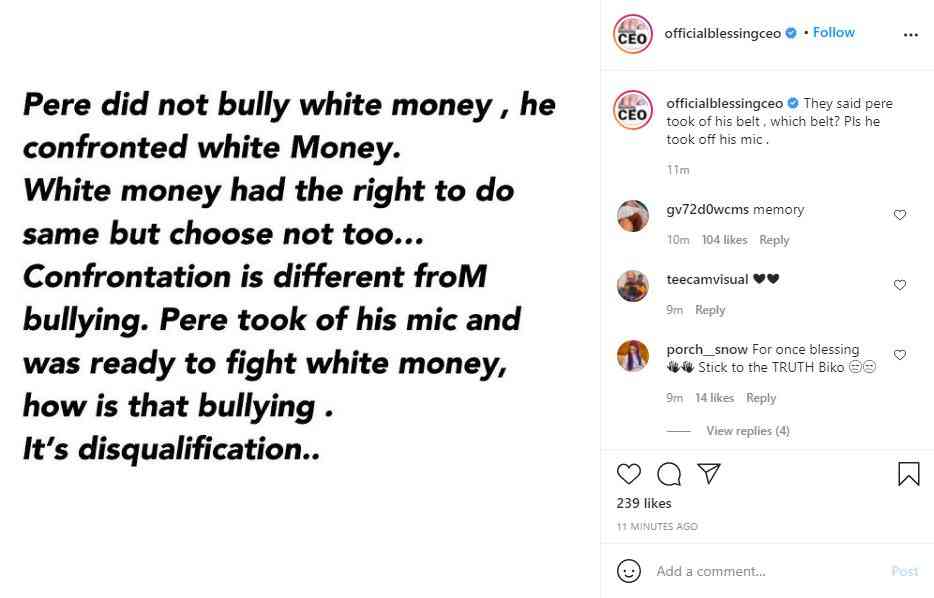 She also tried to draw the line between bullying and confrontation as she maintained that Pere didn’t bully Whitemoney, rather it was a mere confrontation that took place.