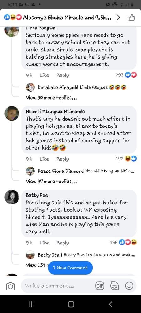Somtoo Ngwu: “Wooo! If the housemate nominate this guy back to back he will definitely gonna leave… I said this From the beginning of this show… Pere was right now WM don gather fans with his strategy… Can you imagine.. Sha it’s well”.