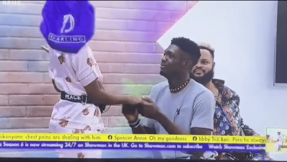 BBNaija Season 6 housemate, Sammie did one of the funniest proposals you’ve ever seen, as he knelt before Peace when asked to choose someone in the house to propose to.