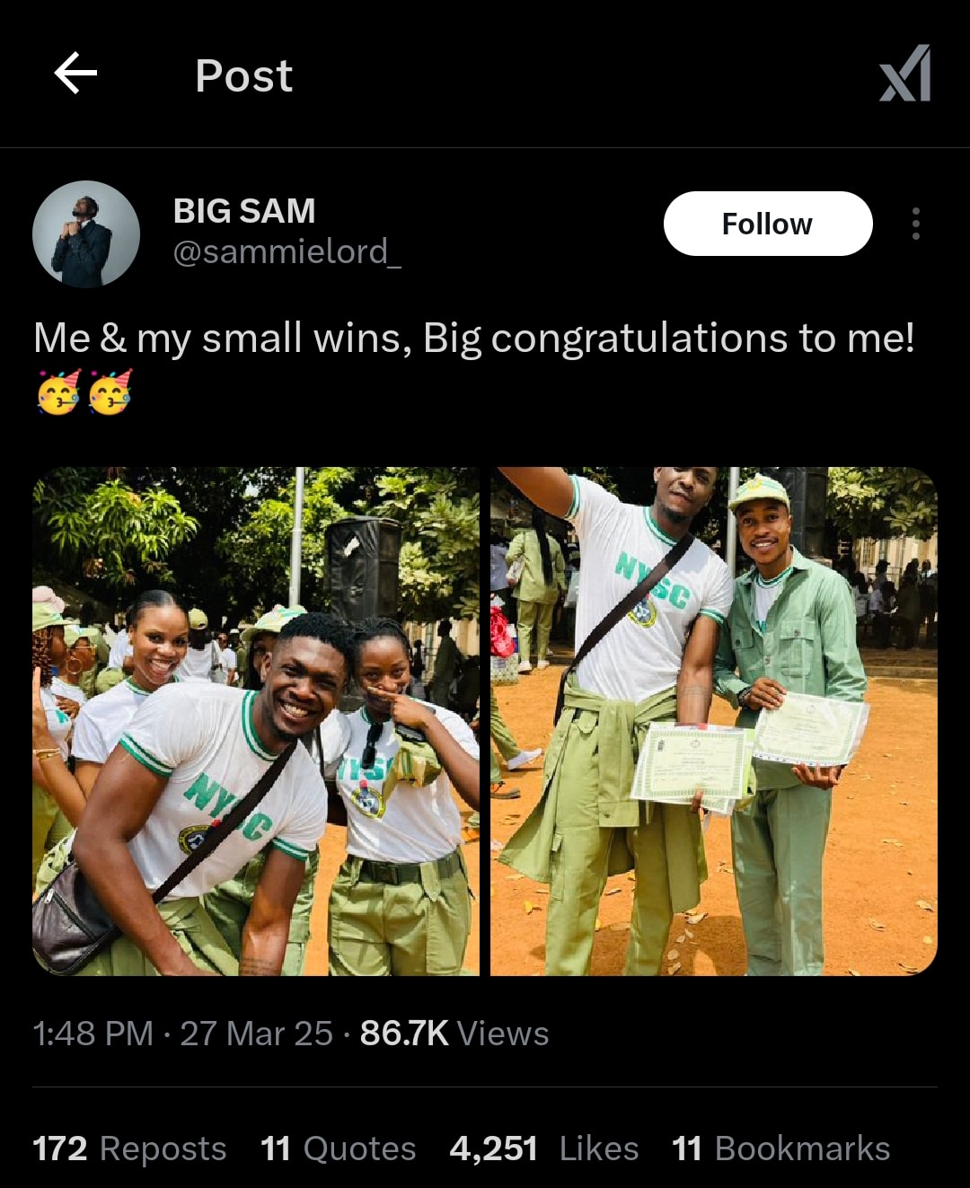 BBNaija season 6 housemate Sammie celebrates as he completes NYSC
