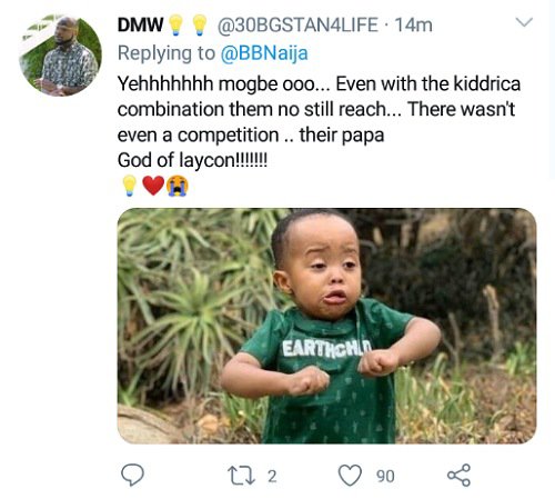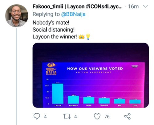 From the results collated, Laycon took the lead with a massive 44.41% of the total votes recorded. Kiddwaya was next to him with a 16.20% votes.