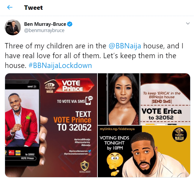 “Three of my children are in the @BBNaija house, and I have real love for all of them. Let’s keep them in the house. #BBNaijaLockdown” he wrote.
