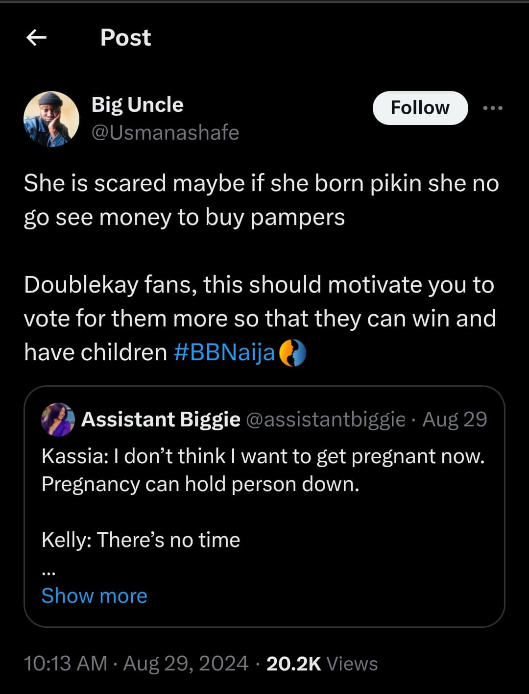 A BBNaija viewer has taken to their comment page to react to housemate Kassia‘s revelation that she is not ready to be pregnant.