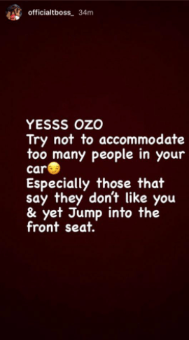 Reacting to Ozo winning a car, TBoss advised Ozo not to accommodate many people in his car especially those who say they don’t like him but jump in the front seat. Ozo has been making advances at Nengi but she has consistently turned him down.