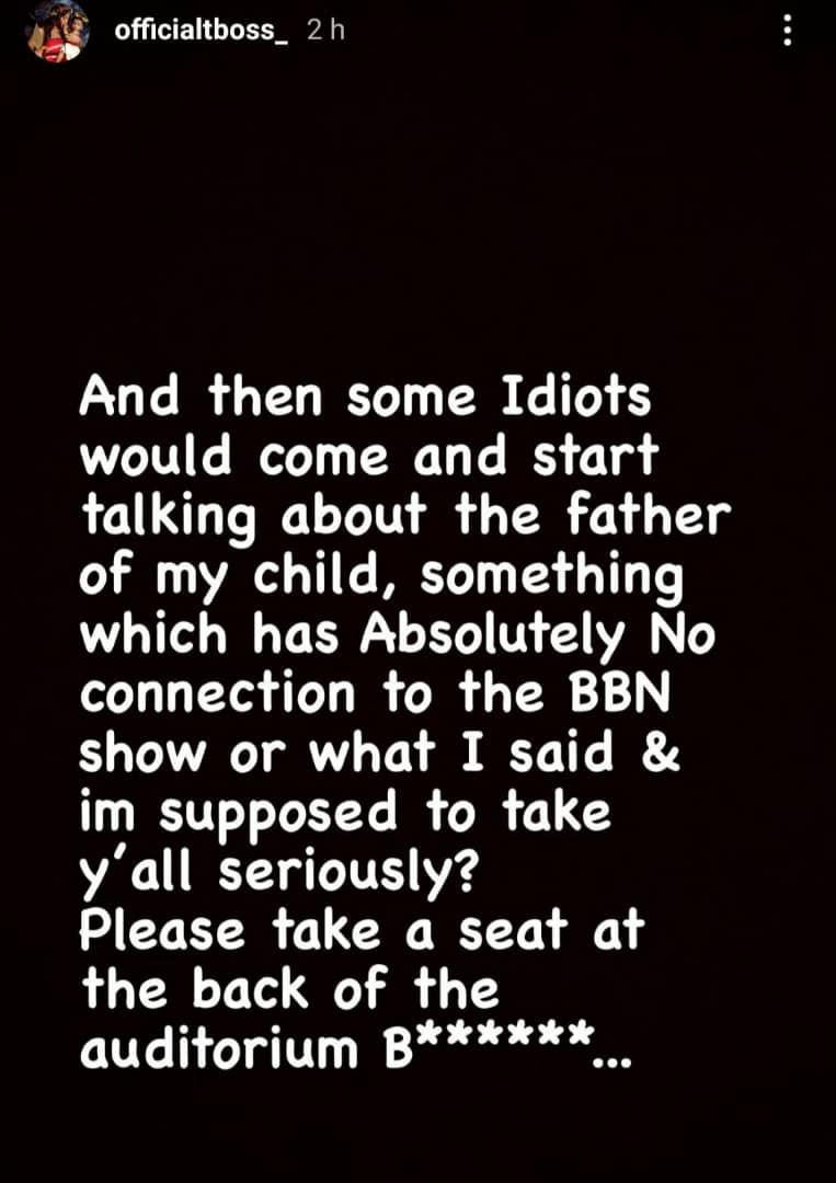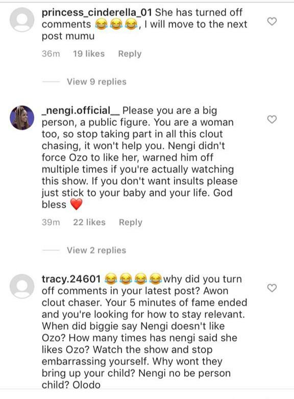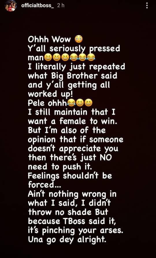 Tboss is currently being bashed on Twitter by Nengi fans for her advice.