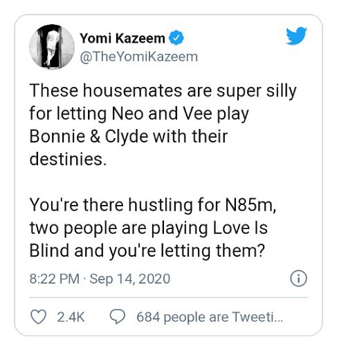 Yesterday, Neo and Vee joined Nengi to secure a spot in the BBNaija finals and a man has slammed housemates for letting Neo Vee play Bonnie & Clyde with their destinies.