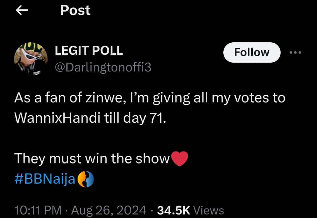 In the post, the user identified himself as a fan of Zinwe but stated his plans to vote for another Housemate, Wanni X Handi, until the end of the show.