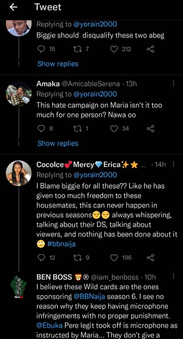 “Bia @Ebuka if Una no strikes or disqualified dis mumus, then una gas refund m my subscription fee ?, you guys had something to say during Erica’s season but now you turning a blind eye?”