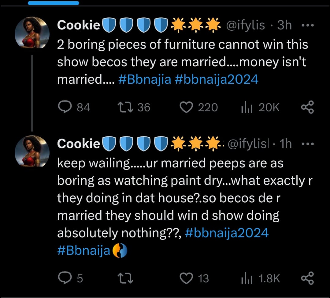 “keep wailing…..ur married peeps are as boring as watching paint dry…what exactly r they doing in dat house?.so becos de r married they should win d show doing absolutely nothing??”