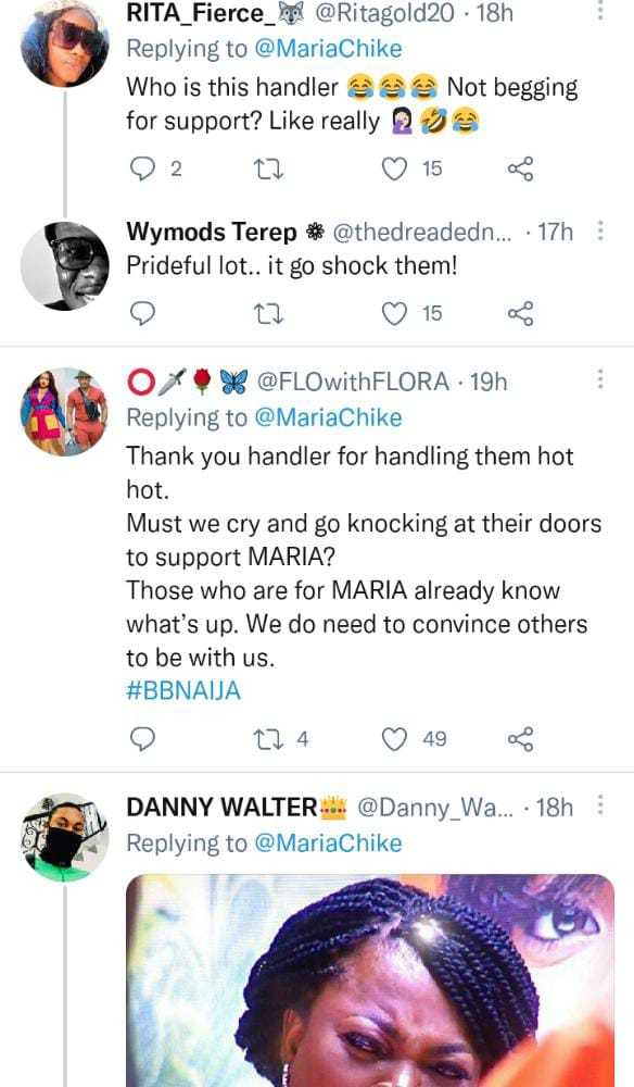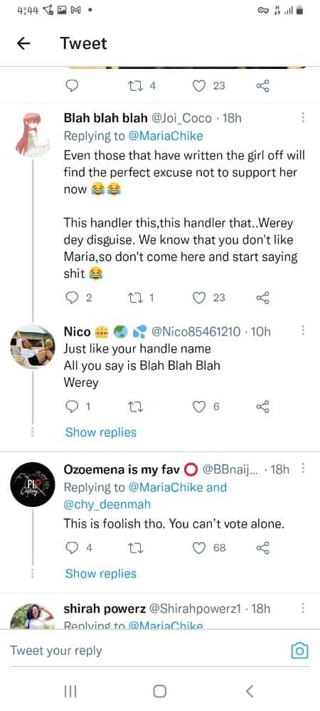 Viewers have reacted to the comment made on Twitter by Maria’s social media handler as she says that Maria does not need to beg or cry to Viewers to get support to win the 90million grand prize.